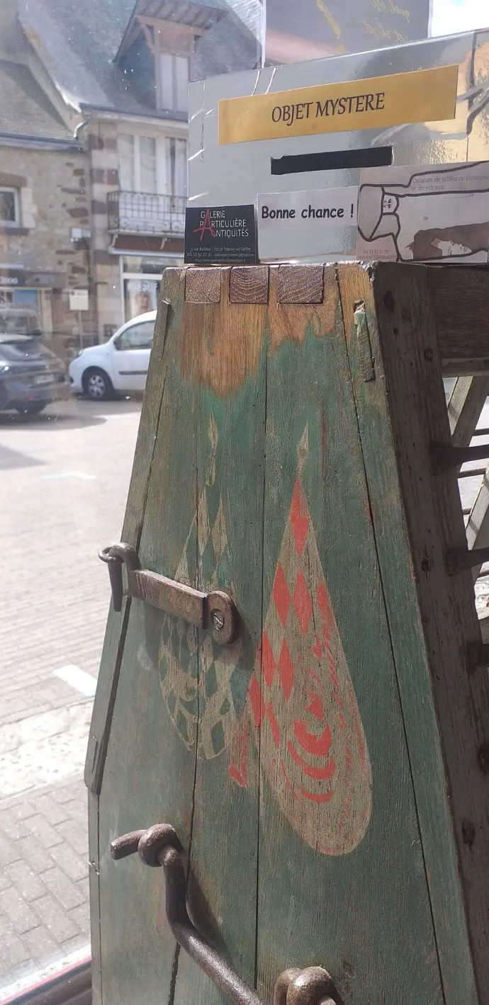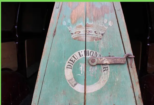 Face à nous, une grande caisse en bois, imposante, dotée d’un étonnant système de verres sur le dessus. La polychromie était encore bien visible, les ferrures massives, travaillées, presque ostentatoires. Sur ses flancs apparaissaient des symboles intrigants : des oriflammes hanséatiques, une devise — Dieu l’Honneur —, et surtout une couronne de comte. L’ensemble dégageait une force et une noblesse évidentes, mais son usage exact restait un mystère.